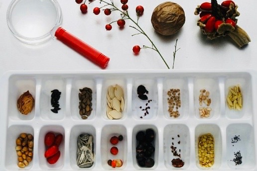 Dica: faça essa atividade com uma lupa para estimular a criança a olhar de perto para os detalhes na hora de distinguir as sementes.
