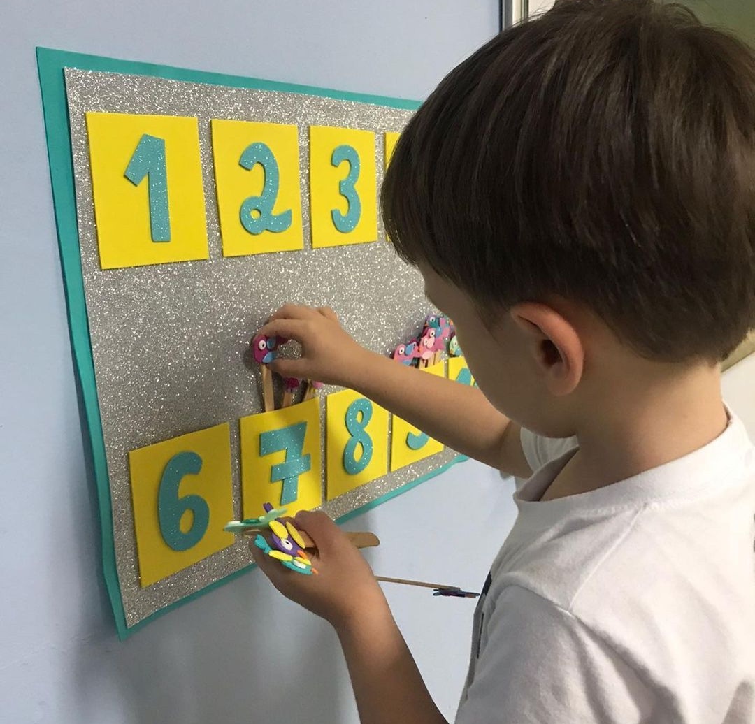 No Jardim 4, em uma unidade cujo foco principal são os números, as crianças estão aprendendo a relacionar a representação gráfica com as quantidades em atividades com giz, jogos de memória, pincel e água, boliche, bingo e mesa de luz. Até as músicas que elas aprendem no decorrer da unidade têm relação com os números.