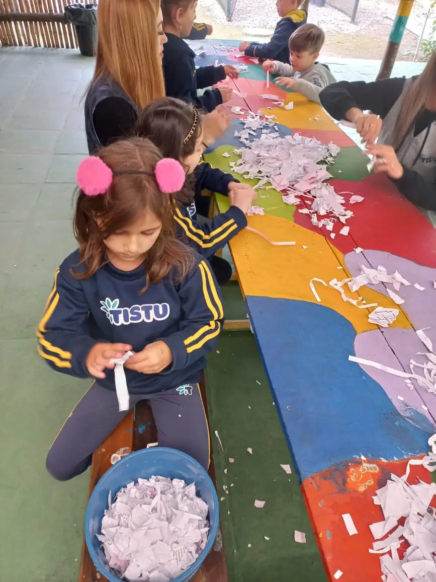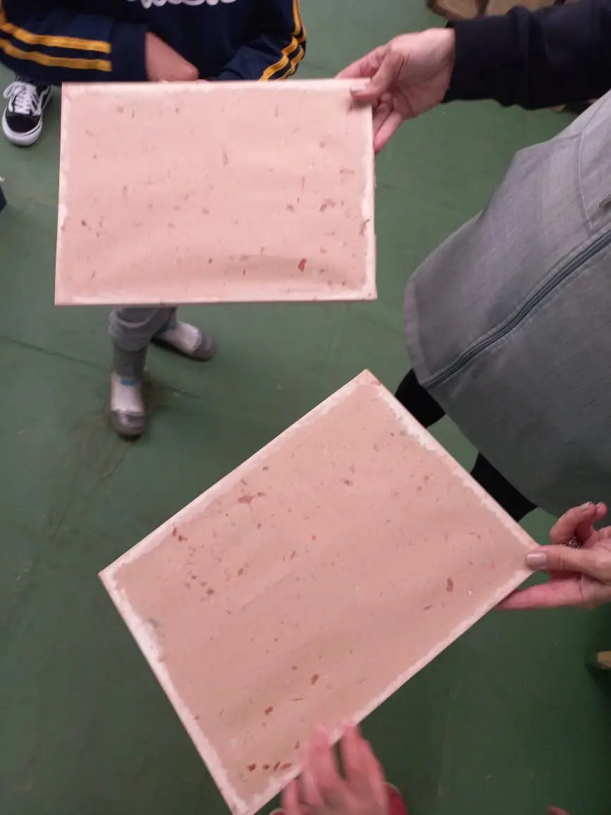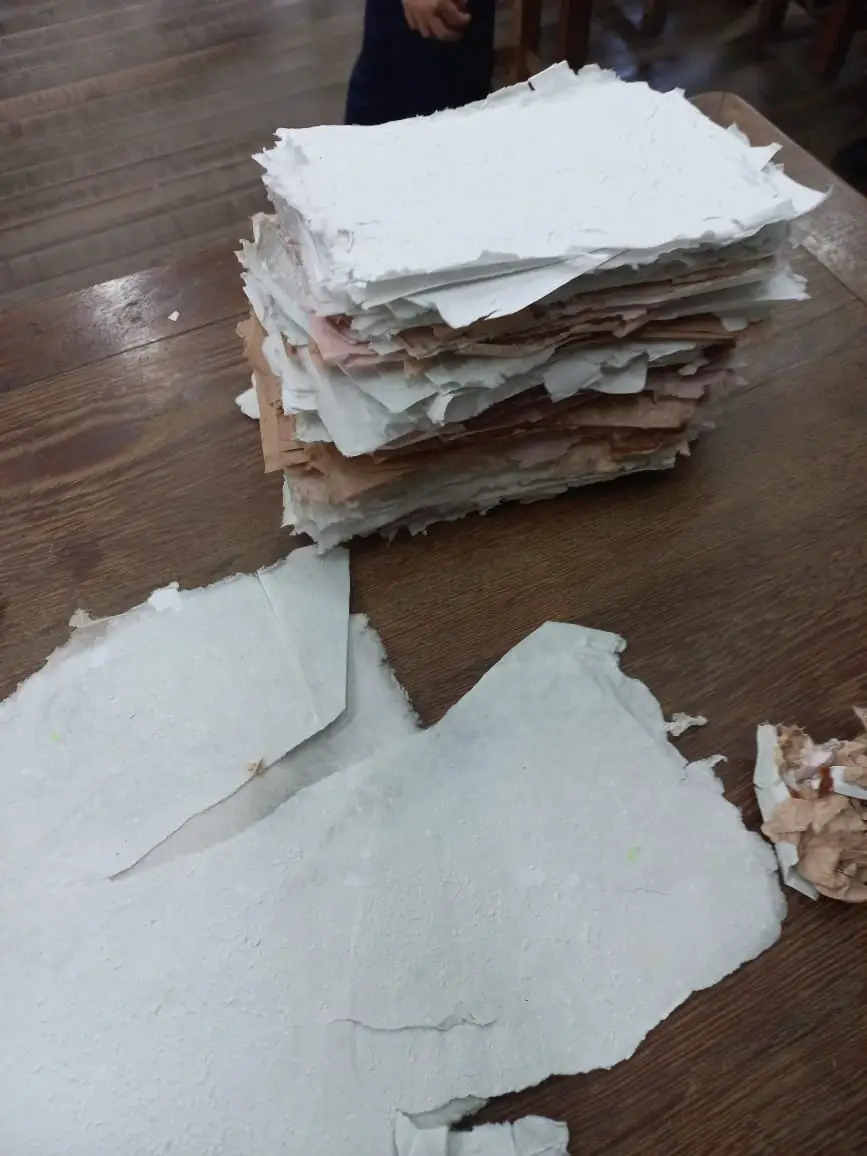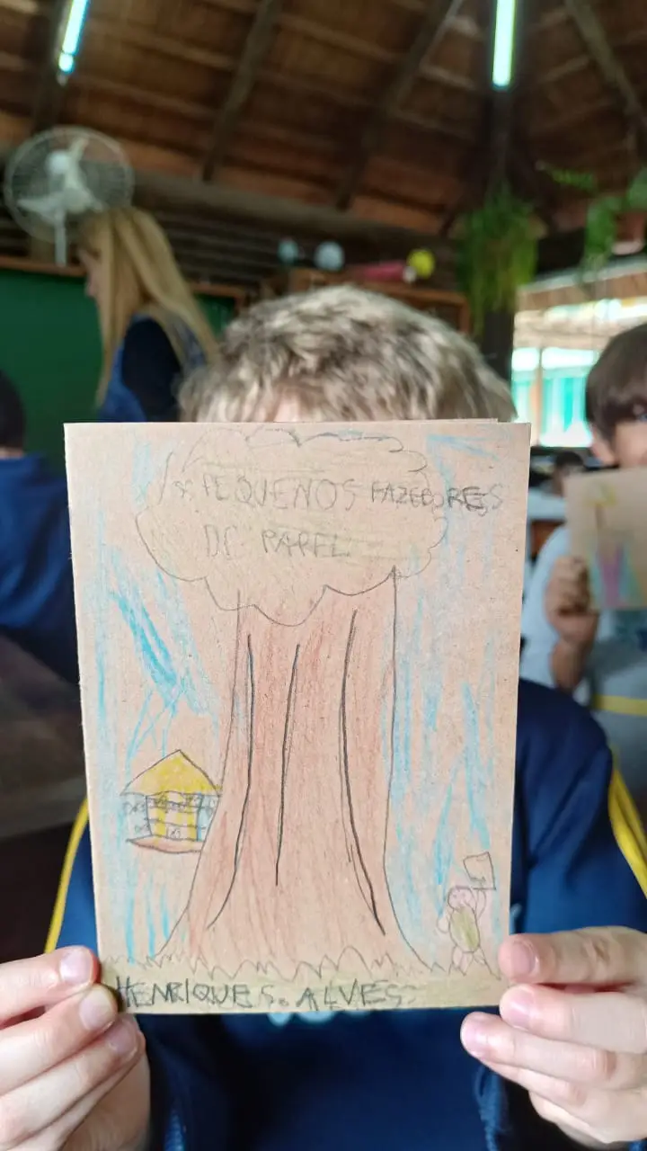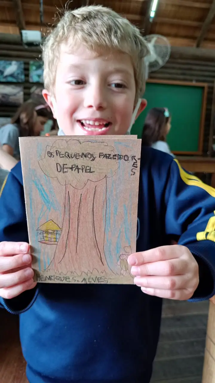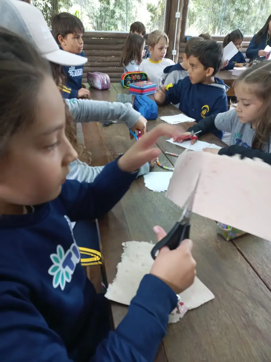Os “pequenos fazedores de papel”, como a atividade é chamada, confeccionam charmosos bloquinhos com o resultado.