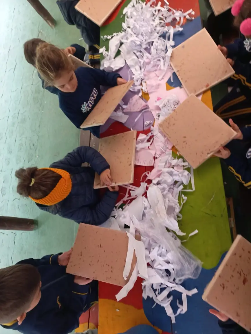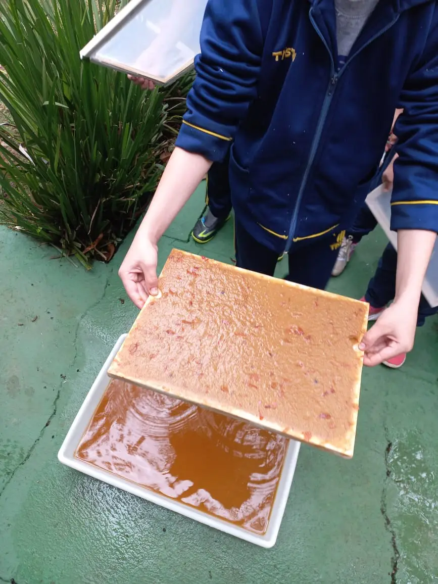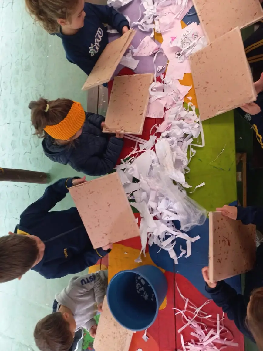 Em uma das iniciativas da toca, as crianças produzem papéis reciclados a partir de restos de materiais coletados na própria escola. Depois de discutirem temas como excesso e redução de desperdício, picotam os papéis, deixam de molho na água com vinagre (o que gera aprendizagem sobre a ação dessa substância sobre microrganismos), passam tudo na peneira e, depois de secos, pintam as folhas com pigmentos naturais produzidos por eles mesmos a partir de elementos como beterraba e cascas de cebola.