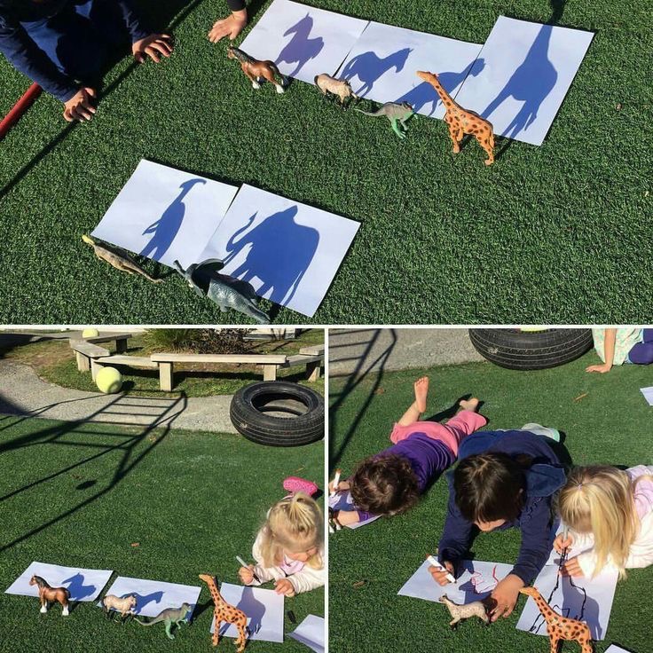 Os dias ensolarados trazem a oportunidade de trabalharmos a coordenação motora e atenção das crianças de uma forma bem diferente. O contorno das sombras pode ser feito com vários tipos de bonecos, mas se você tem animais ou dinossauros, o resultado fica mais interessante, por haver tantas formas diferentes que podem ser exploradas.