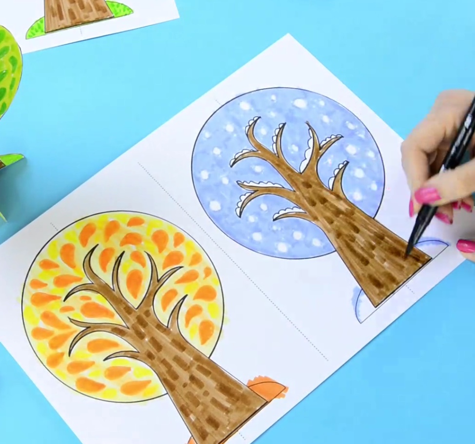 - Pinte com a criança cada árvore representando uma estação. Use cores das estações, como laranja e vermelho no outono, colorido na primavera, verde no verão e azul no inverno.