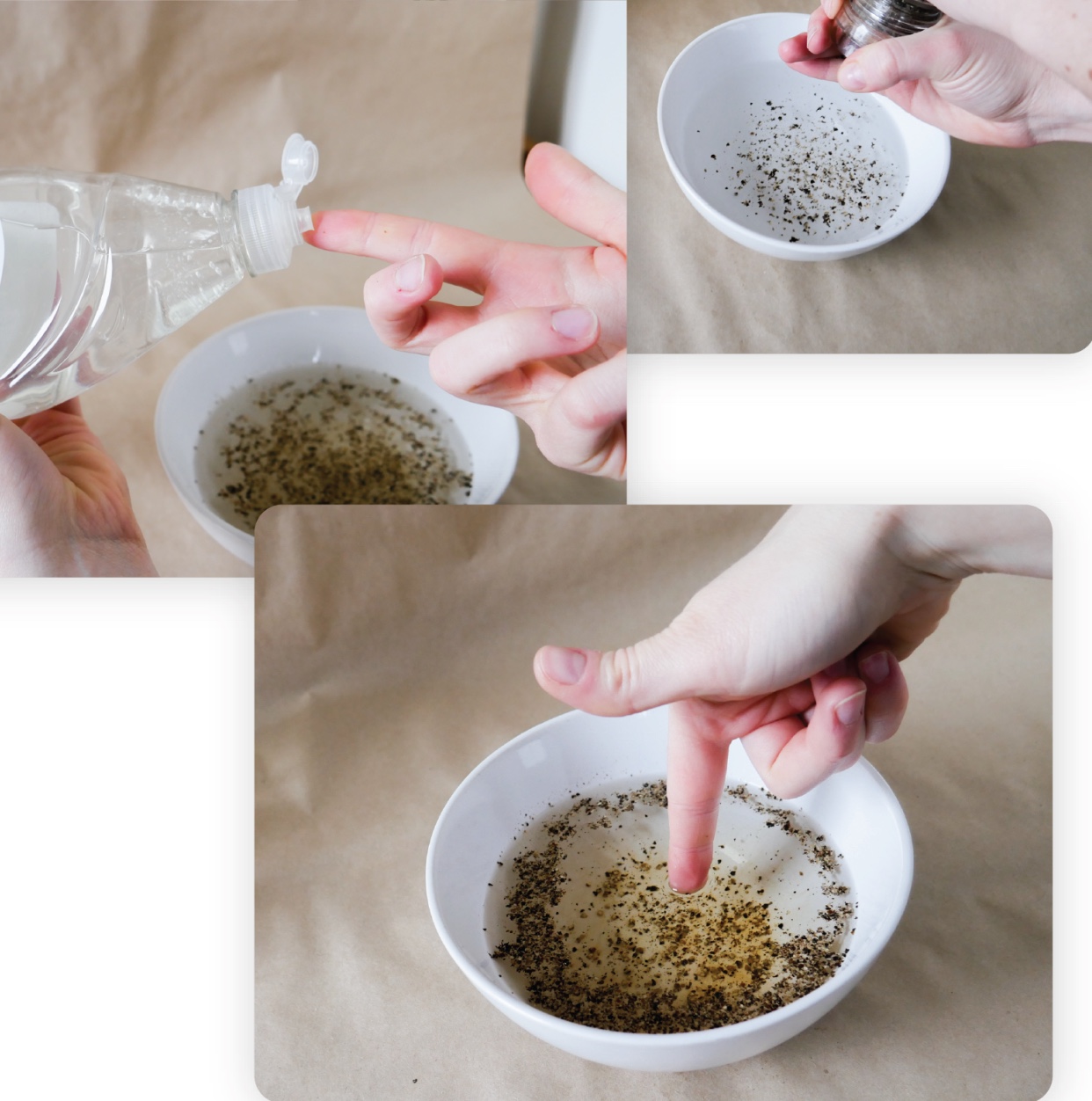 - Peça à criança que coloque o dedo na água. Ela vai observar que seu dedo ficou cheio de pimenta. Elas representam os germes.