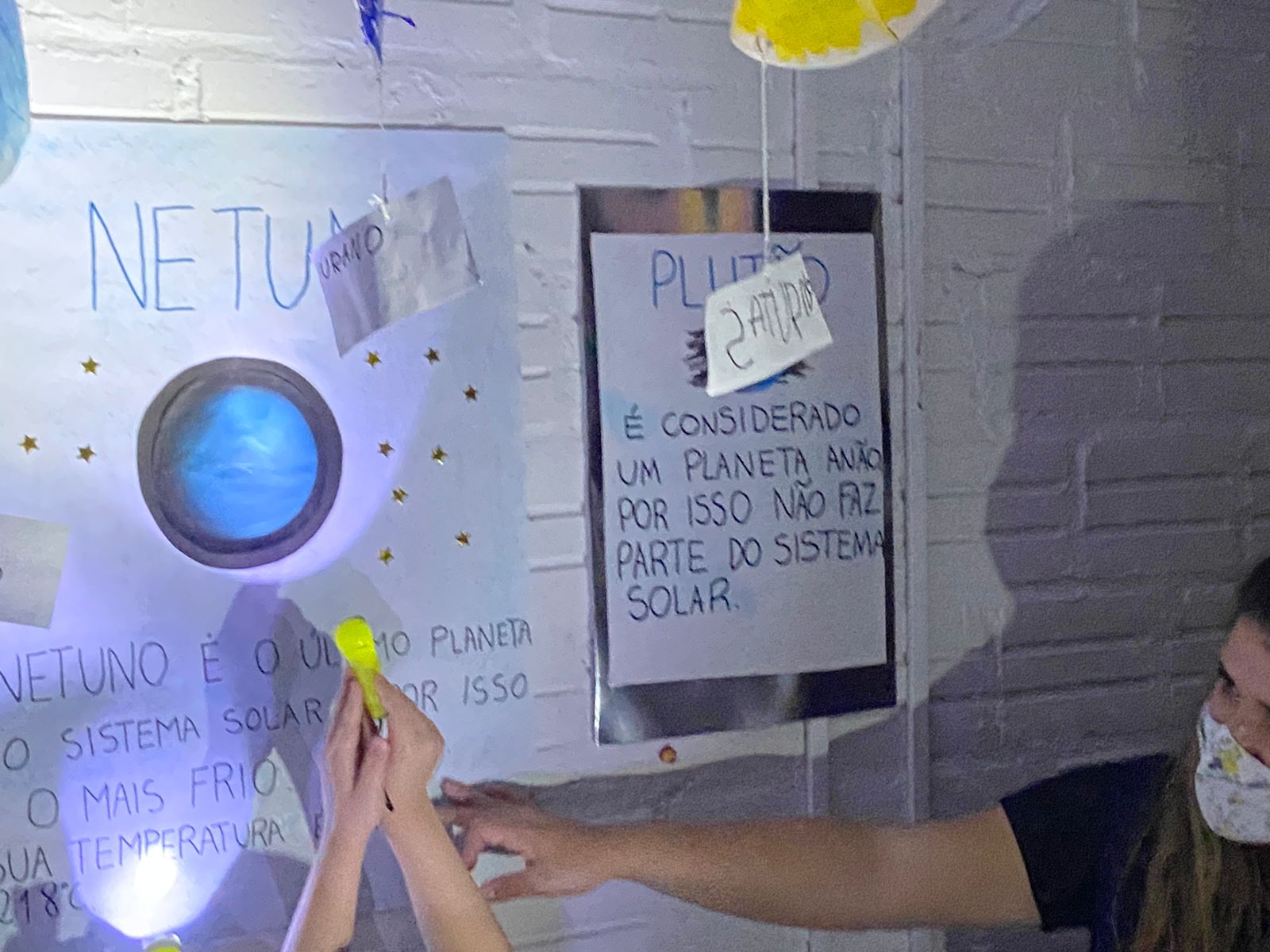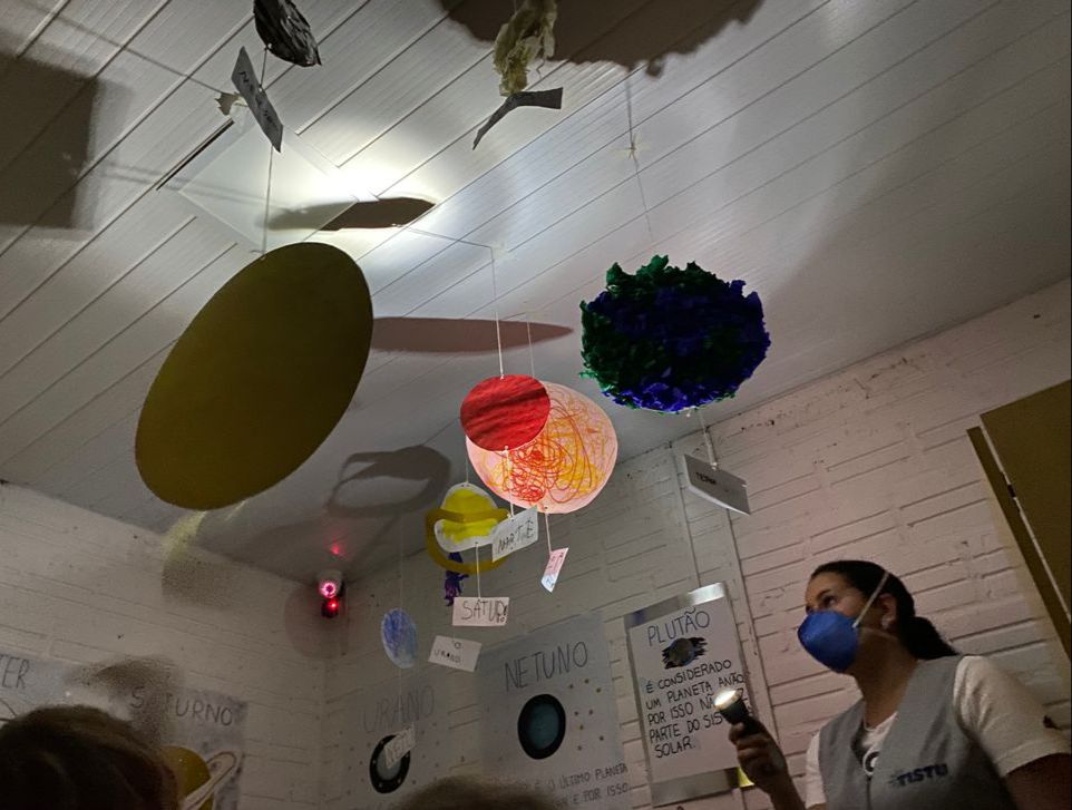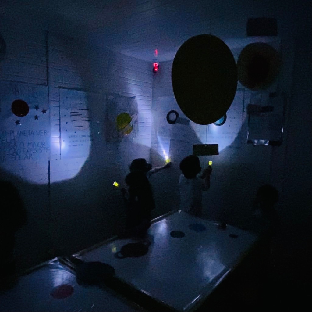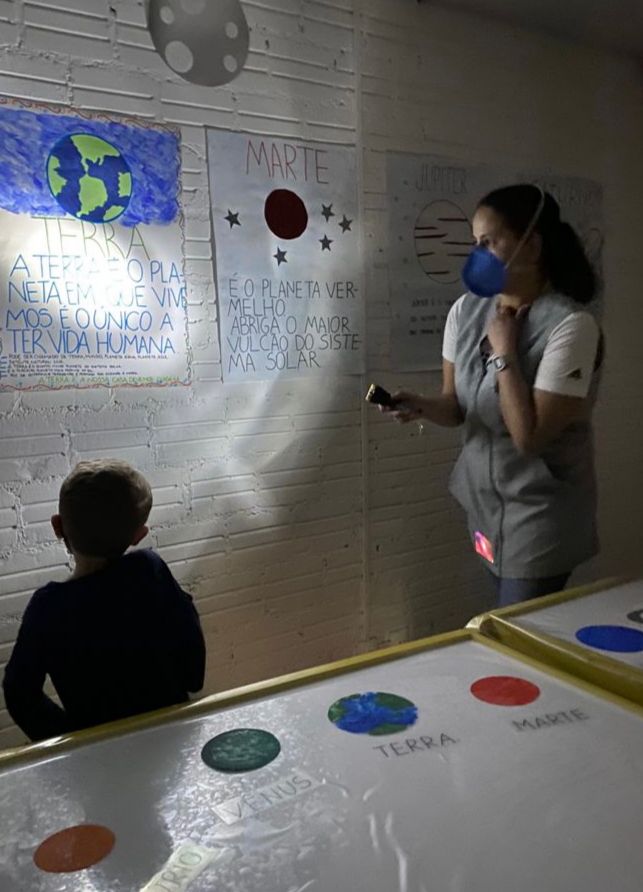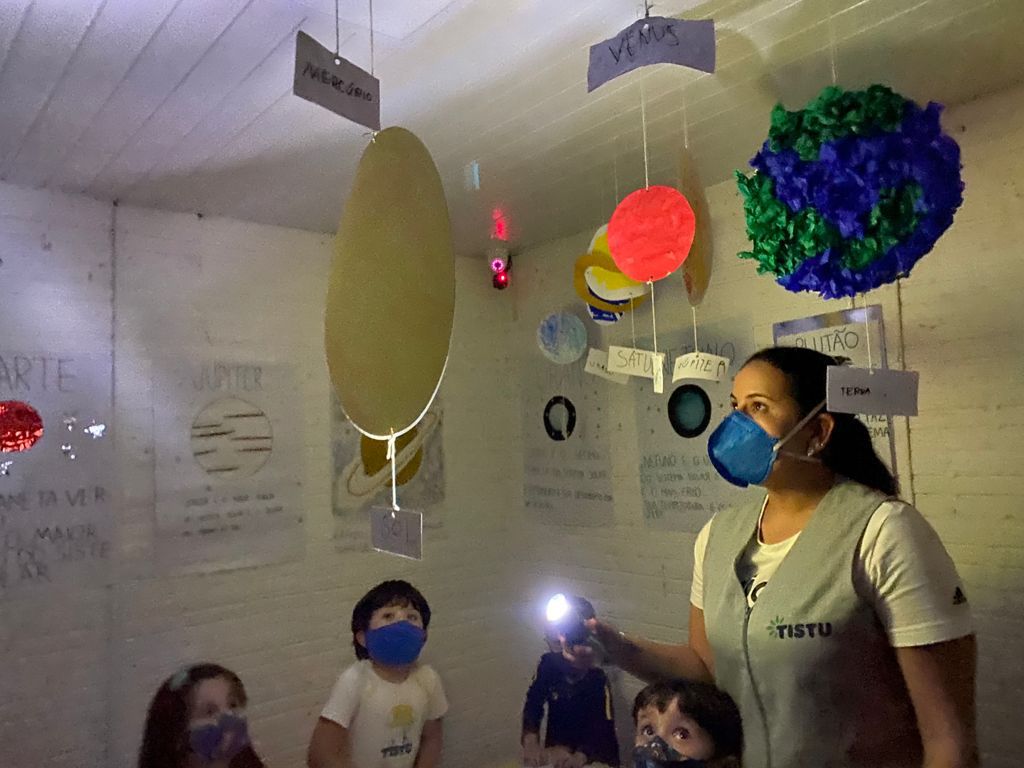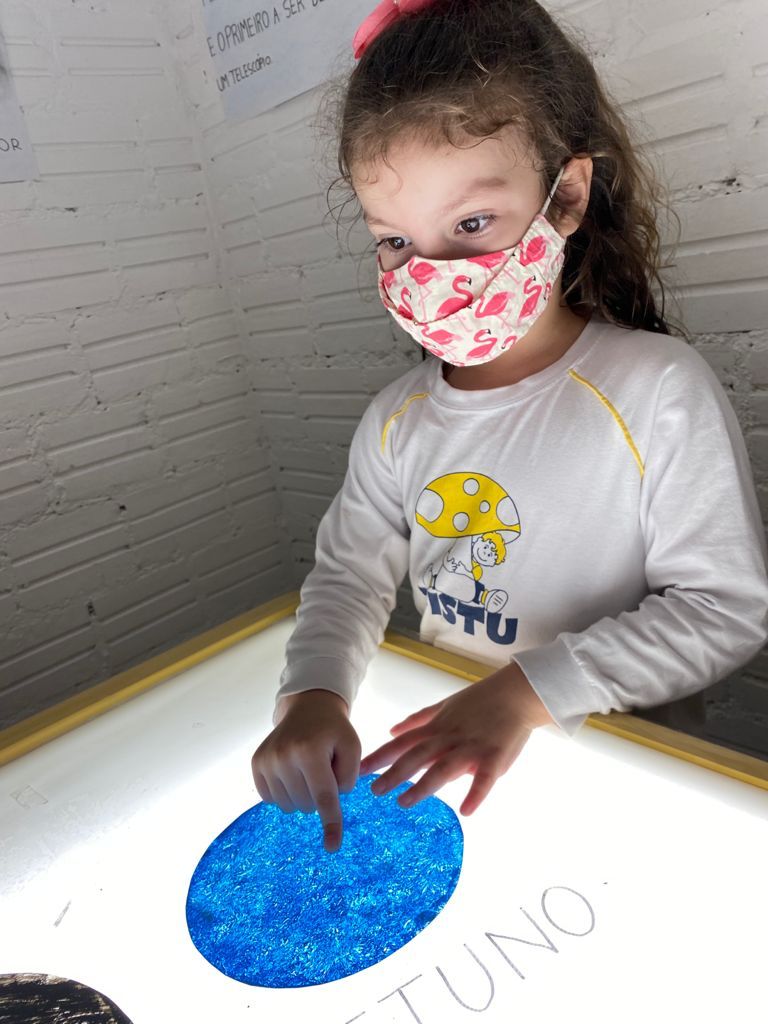 As turminhas do Jardim 4 exploraram o espaço por meio de uma série de atividades interativas e muito empolgantes. Em uma delas, manipularam os planetas do sistema solar sobre mesas de luzes – um recurso que o Tistu utiliza com frequência em aulas de artes e ciências, por manter as crianças atentas e engajadas por mais tempo.